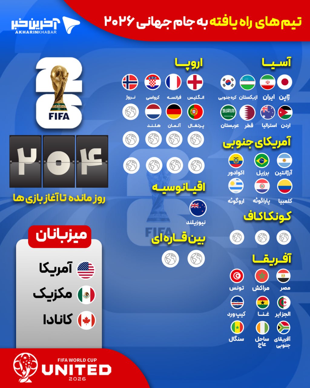 آخرین خبر/شمارش معکوس برای جام جهانی ۲۰۲۶ در حالی آغاز شده که این دوره با حضور ۴۸ تیم و به میزبانی مشترک کانادا، آمریکا و مکزیک، بزرگترین نسخه تاریخ این مسابقات خواهد بود. رقابتهایی که از ۱۱ ژوئن تا ۱۹ ژوئیه ۲۰۲۶ (۲۱ خرداد تا ۲۸ تیر ۱۴۰۵) برگزار میشود و دیدار فینال در ورزشگاه «متلایف» نیوجرسی برگزار خواهد شد.