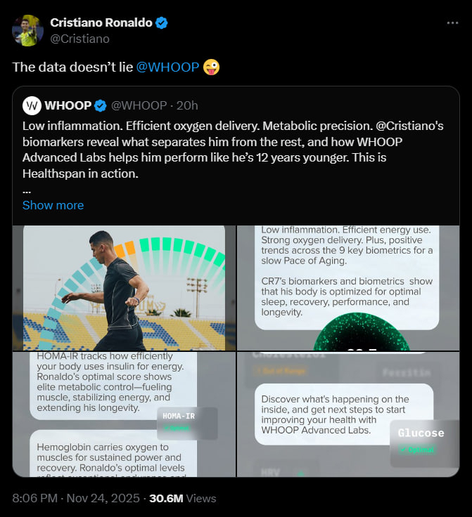 اطلاعات بیومتریک نشان داد بدن رونالدو «برای خواب، ریکاوری، عملکرد و طول عمر به طور کامل در شرایط ایدهآل قرار دارد» و تحلیل HOMMA-AR که کارایی انسولین در تولید انرژی را میسنجد، نشان میدهد این ستاره باتجربه دارای «کنترل متابولیک برتر، تغذیه مناسب عضلات، حفظ پایداری انرژی و افزایش طول عمر» است.