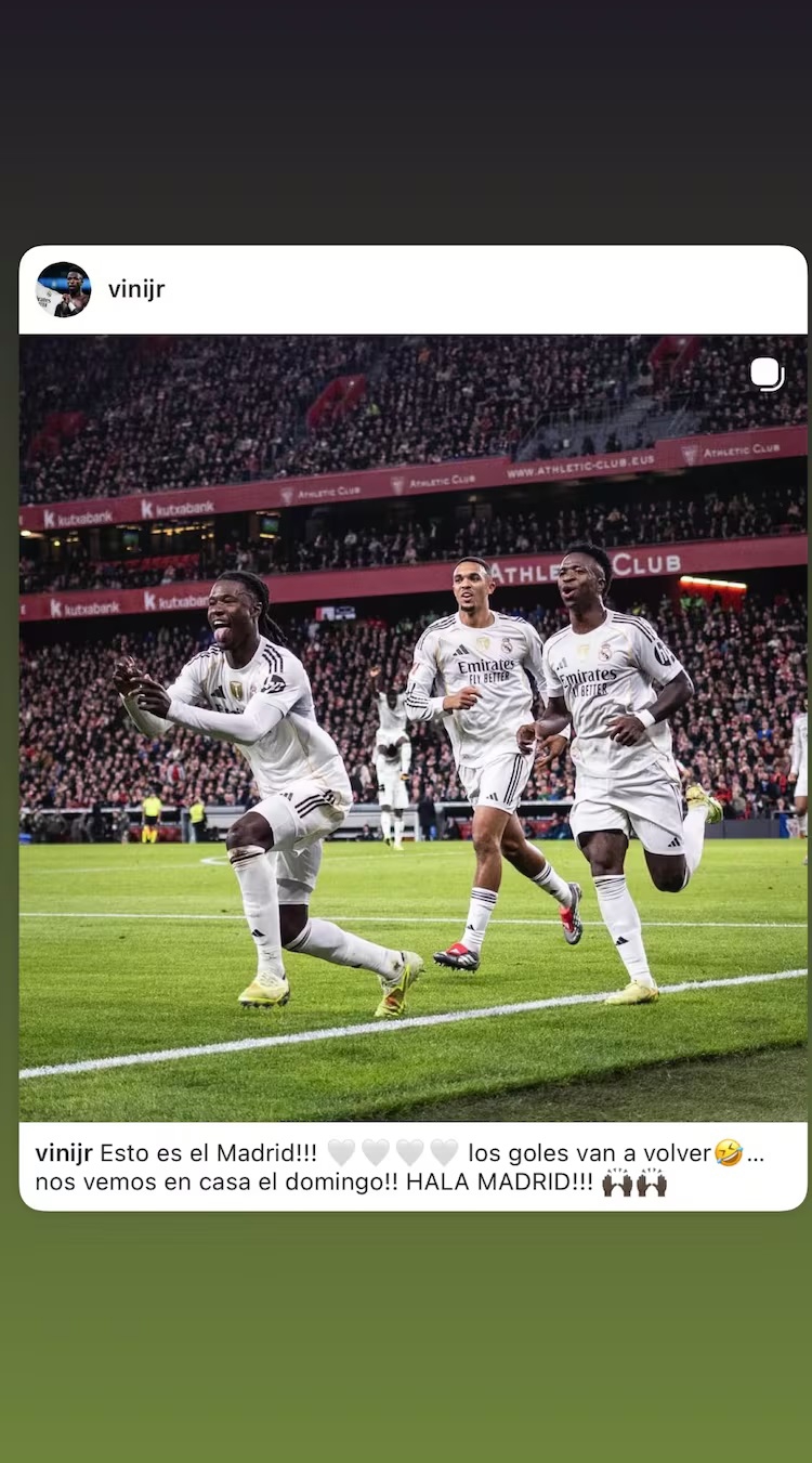 بازیکن فرانسوی تنها کسی نبود که این حس را منتقل کرد. وینیسیوس نیز که شب گذشته عملکرد بسیار خوبی داشت و در آغوش گرفتن ژابی آلونسو هنگام تعویض، تصویر جنجالیای ایجاد کرد، نوشت: «این یعنی رئال مادرید. گلها برمیگردند. یکشنبه در خانه میبینمتان! زنده باد مادرید!»