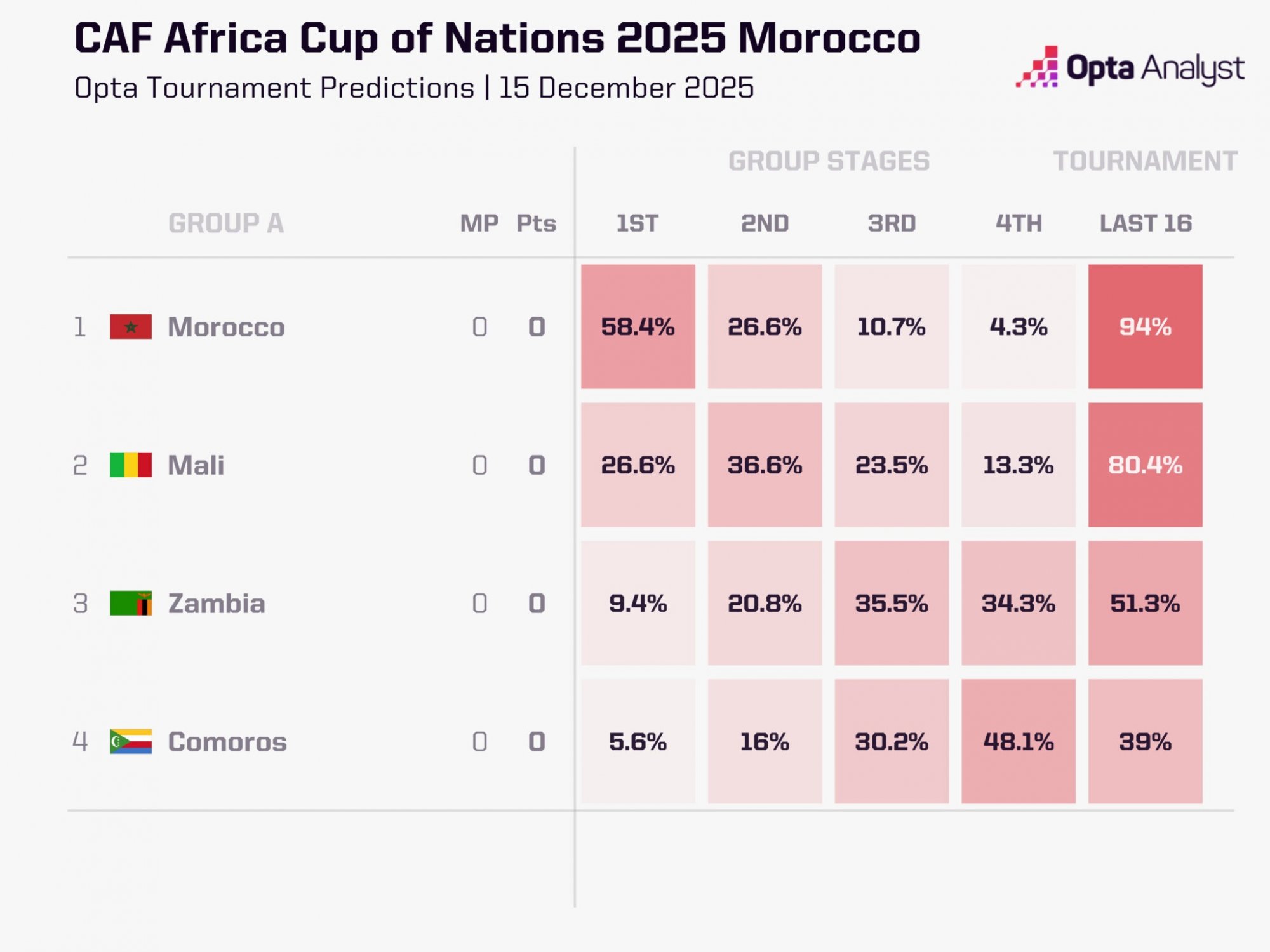 مراکش با 19.1 درصد شانس قهرمانی، در صدر پیشبینیها قرار دارد. تیم تحت هدایت ولید الرکراکی با تکیه بر امتیاز میزبانی و یک روند فوقالعاده، جدیترین گزینه فتح جام معرفی شده است. مراکش با 18 پیروزی متوالی وارد تورنمنت میشود؛ آماری که شامل 50 گل زده و تنها چهار گل خورده است. حضور ستارههایی مثل اشرف حکیمی، براهیم دیاز، یوسف النصیری و یاسین بونو، این تیم را از نظر توازن دفاع و حمله در موقعیت ممتازی قرار داده است. طبق پیشبینی اوپتا، مراکش با احتمال 94 درصد از گروه خود صعود میکند.