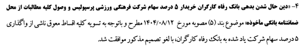 بر اساس بند ۵ مصوبهای که پیشتر در تاریخ ۱۲ آبان ۱۴۰۴ صادر شده بود، به دلیل عدم پایبندی بانک رفاه به تعهدات مالی و پرداخت نکردن اقساط خرید سهام، دستور «دین حال شدن» بدهی این بانک صادر شده بود.