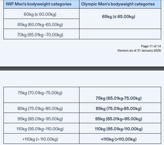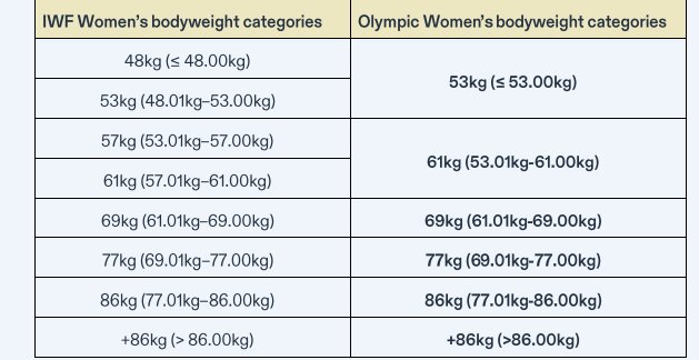 اگر ورزشکار در اوزان غیر المپیکی وزنه بزند، رکورد و امتیاز او برای نزدیکترین وزن المپیکی محاسبه میشود.