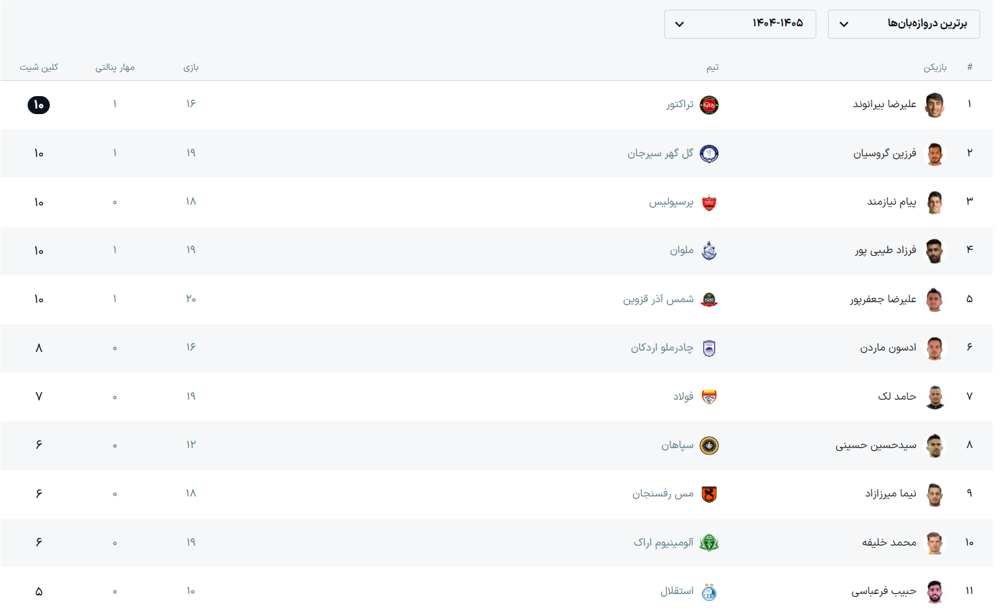 ورزش 3/فقر گلزن و گلزنی در لیگ برتر تماشاگرپسند نیست اما دروازهبان پسند است. فرزین گروسیان، علیرضا بیرانوند، پیام نیازمند، فرزاد طیبی پور و علیرضا جعفرپور پنج سنگربانی هستند که تا به حال کلینشیتهایشان در این فصل دو رقمی شده است. پنج مدعی جدی برای کسب دستکش طلایی در رقابتند.