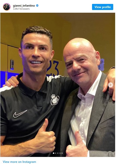 با وجود تمام این بحرانها، نفر اول فوتبال جهان با انتشار پیامی در اینستاگرام، به تمجید از شخصیت حرفهای رونالدو پرداخت. اینفانتینو در این پیام خطاب به کریستیانو نوشت: «یک برنده مادرزاد، درهمشکننده رکوردها و نماد واقعی جاهطلبی، حرفهایگری و ارادهای که هرگز متوقف نمیشود.» او در ادامه نوشت: «تولدت مبارک کریستیانو؛ ممنون که مرزها را جابهجا کردی و به نسلها الهام بخشیدی تا رویاهای بزرگتری در سر بپرورانند.»