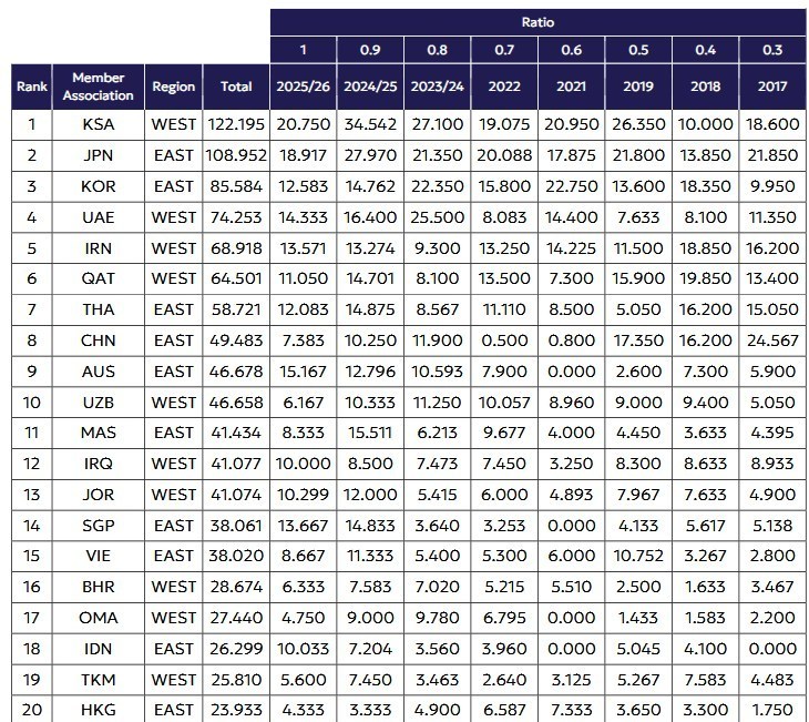 این ردهبندی در پایان فصل 26-2025 تعیینکننده سهمیه کشورها در فصل 28-2027 باشگاهی آسیا خواهد بود. ایران در صورتی که در پایان فصل نیز جایگاه پنجم را حفظ کند، 1+2 سهمیه در لیگ نخبگان آسیا و یک سهمیه مستقیم در لیگ قهرمانان آسیا 2 خواهد داشت.