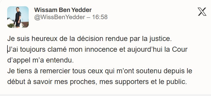 وسام بن یدر با انتشار تصویری از خود در صفحه شخصیاش در شبکه اجتماعی ایکس (توییتر سابق)، از واژه «ممنونم» استفاده کرد و شادی خود را از این رای پنهان نکرد. او در پیامی کوتاه اما پرمعنا خطاب به هوادارانش نوشت: «از تصمیمی که توسط دستگاه عدالت صادر شد، عمیقا خوشحالم. من همیشه بر بیگناهی خود پافشاری کرده بودم و امروز دادگاه تجدیدنظر صدای مرا شنید. میخواهم از تمام کسانی که از ابتدا حامی من بودند، از جمله نزدیکانم، هواداران و مردم، صمیمانه تشکر کنم.»