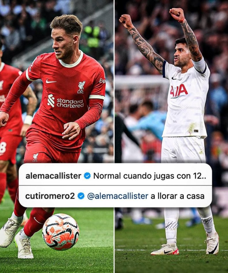 الکسیس مک آلیستر، هافبک آرژانتینی لیورپول، در قسمت نظرات پست اینستاگرامی کریستین رومرو، هموطنش در تاتنهام، نوشت:"(کسب برد) با 12 بازیکن طبیعی است." رومرو هم به این بازیکن با یک کری خوانی جواب داد:"در خانه گریه کن!"