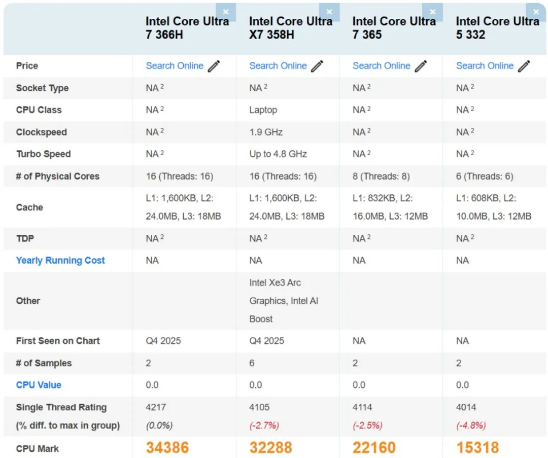 چند مدل از پردازندههای نسل جدید اینتل پنترلیک (Panther Lake) با نام تجاری Core Ultra Series 3 در دیتابیس PassMark بنچمارک شدهاند. اینبار نه یک یا دو، بلکه چهار مدل مختلف شامل Core Ultra 7 366H ،Ultra X7 358H ،Ultra 7 365 و Ultra 5 332 فاش شدهاند که هم مشخصات فنی و هم بخشی از توان پردازشی اولیهی این تراشهها را مشخص میکند.
