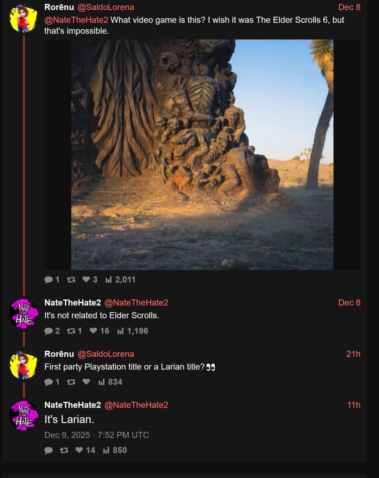 حالا در آخرین گزارش معتبر، منبع داخلی مشهور، NateTheHate، اعلام کرده که این مجسمه مربوط به بازی بعدی Larian Studios است. وی در پاسخ به یک کاربر که پرسیده بود آیا این مجسمه میتواند Elder Scrolls بعدی باشد یا خیر، به طور صریح گفت: