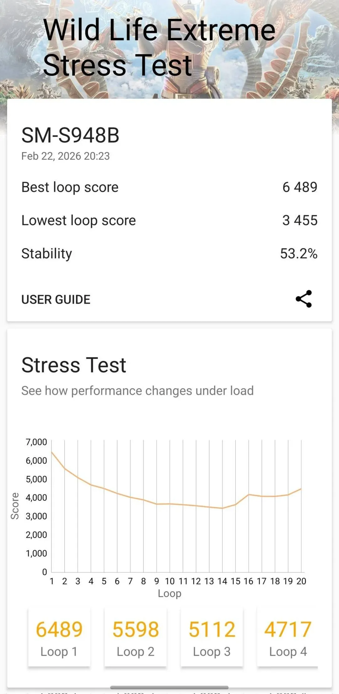 عملکرد گرافیکی S26 اولترا در آزمون استرس 3DMark با بیشینهی امتیاز ۶۴۸۹ و پایداری ۵۳٫۲ درصدی همراه بوده است. دمای دستگاه طی این تست فقط ۱۰ درجه افزایش یافته است که از بهبود سیستم خنککننده حکایت دارد.