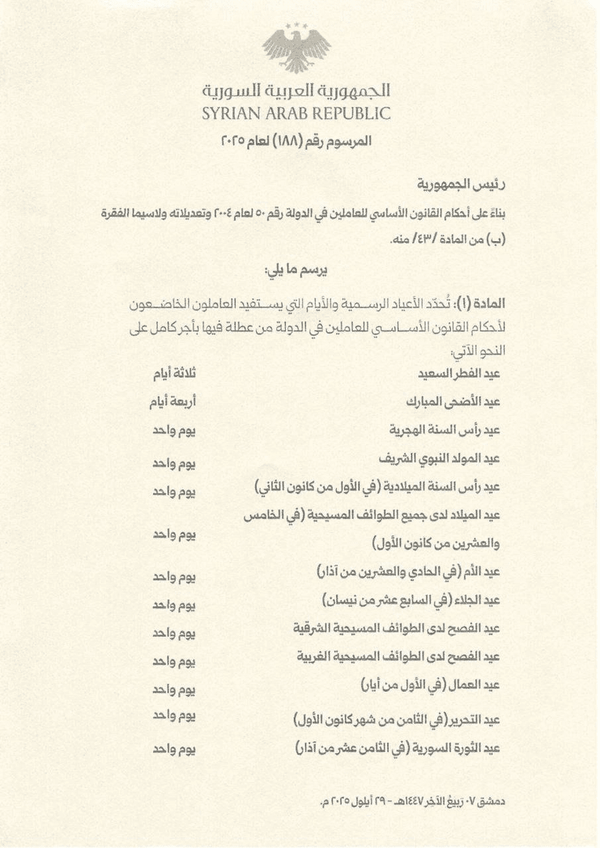 منابع رسمی سوریه، بعدازظهر امروز (یکشنبه) گزارش دادند که فرمان تازه الجولانی شامل حذف چندین تعطیلی رسمی است که ریشه در تاریخ ملیگرایی سوری دارد. برجستهترین این مناسبتها، روز شهدا (۶ مه) است؛ روزی که یادبود اعدام دهها مبارز سوری و لبنانی بهدست «جمال پاشا» والی عثمانی ملقب به «قصاب» برگزار میشد.