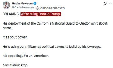 جماران/ گوین نوسام فرماندار کالیفرنیا اعلام کرد که از دونالد ترامپ رئیس جمهور آمریکا به دلیل فرستادن نیروهای گارد ملی به ایالت اورگن شکایت خواهد کرد.