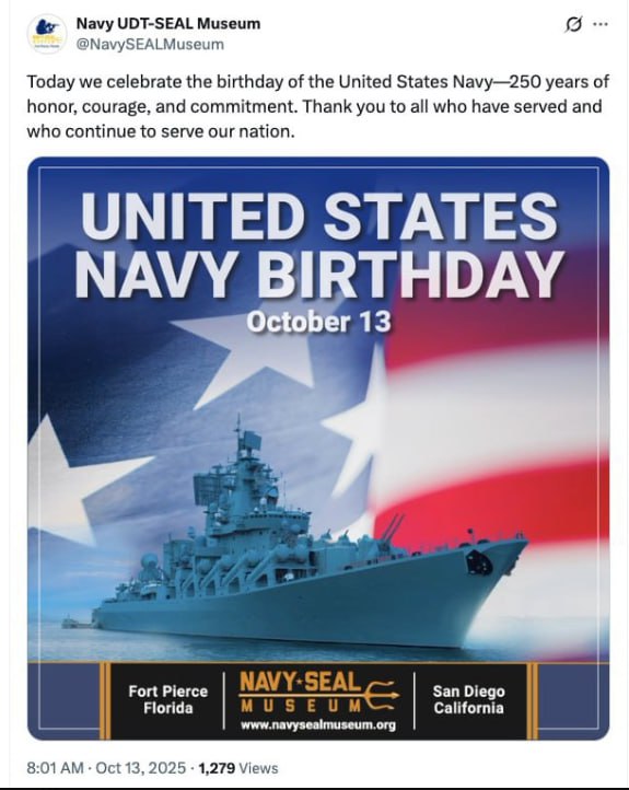 تسنیم/ حساب موزه نیروی دریایی آمریکا به مناسبت سالگرد تاسیس این نیرو عکسی منتشر کرد که به اشتباه در آن از تصویر ناو موشکانداز واریاژ روسی برای تبریک استفاده شده بود.