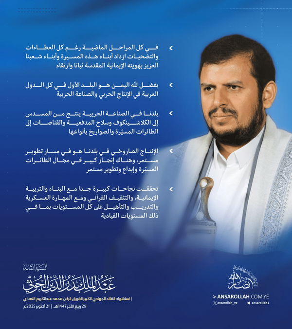 رهبر انصار الله با اشاره به اینکه ملت یمن، پرچم جهاد در راه خدا برای مقابله با طاغوت زمانه -آمریکا و اسرائیل- را برافراشته است، گفت: یهودیان صهیونیست و آمریکاییها، جنایات، دسیسهها، اهداف و برنامههای اسرائیل هستند. وی ضمن قدردانی از مواضع شرافتمندانه ملت یمن در مبارزه با اسرائیل و آمریکا، تصریح کرد: کسانی که در جهت مخالف و در راستای کمک به اسرائیل حرکت کردند، در مواضع ننگینی قرار گرفتند که مایه شرم آنهاست. رهبر انصارالله با بیان اینکه یمن در بین تمام کشورهای عربی، در تولیدات نظامی، یک کشور پیشرو است، گفت: یمن سلاحهای مختلفی تولید میکند، از کلاشینکوف گرفته تا انواع پهپاد و موشک. تولید موشک کشور ما روند رو به رشدی دارد و در زمینه پهپاد، دستاوردهای بزرگی حاصل شده است.
