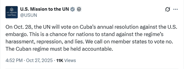 آمریکا با این تبلیغات موفق شد آرژانتین، مجارستان، مقدونیه شمالی، پاراگوئه و اوکراین را به همراه اسرائیل در کنار خود و در جبهه مخالف قرار دهد. سال گذشته، ۱۸۷ کشور به این قطعنامه رأی مثبت داده بودند و تنها آمریکا و اسرائیل مخالف بودند. کوبا اتهامات آمریکا درباره حضور نیروهای شبهنظامی این کشور در اوکراین را «بیاساس» خوانده و آن را رد کرده است. هر چند کوبا در موضعگیریهای سیاسی از روسیه در جنگ اوکراین حمایت کرده اما همزمان بر ضرورت برگزاری مذاکرات صلح برای پایان دادن به درگیریها حمایت کرده است. برونو رودریگز، وزیر خارجه کوبا، پیش از رأیگیری در مجمع عمومی سازمان ملل درباره تحریمهای آمریکا گفت: «این محاصره، سیاستی برای مجازات جمعی است و به طور آشکار، گسترده و سیستماتیک حقوق بشر کوباییها را نقض میکند و هیچ تمایزی بین طبقات اجتماعی یا فعالان اقتصادی قائل نیست. کوبا تسلیم نخواهد شد.» این قطعنامه از سال ۱۹۹۲ هر ساله در مجمع عمومی سازمان ملل تصویب شده است. با این حال، تنها کنگره آمریکا میتواند تحریمهای دوران جنگ سرد را لغو کند.آمریکا در سال ۲۰۱۶ و در دوران باراک اوباما برای اولین بار به این قطعنامه رأی ممتنع داد، اما در دولت اول دونالد ترامپ بار دیگر به مخالفت بازگشت و تقریباً تمام اقدامات اوباما برای کاهش تحریمها و بهبود روابط با کوبا را لغو کرد. این سیاست در دولت جو بایدن نیز ادامه یافت.