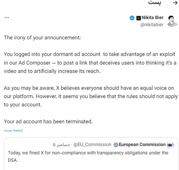 نیکیتا بیر، رئیس بخش تولیدات ایکس، در پاسخ به پست کمیسیون اروپا ( که جریمه ۱۲۰ میلیون یورویی (حدود ۲۱۱ میلیون دلار استرالیا) علیه این پلتفرم بهدلیل نقض قوانین شفافیت را اعلام کرده بود) نوشت: «حساب تبلیغاتی شما پایان یافت.»
