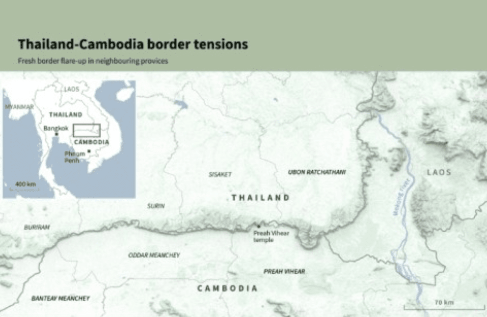 صبح امروز چهارشنبه، خبرنگاران حاضر در استان شمالغربی سامرانگ در کامبوج صدای انفجارهای سنگین توپخانه را از ناحیه معابد باستانی در مناطق مورد مناقشه شنیدهاند؛ معابدی که سالهاست موضوع اختلاف مرزی میان دو همسایه است. تا ظهر امروز، دهها خانواده که از دوشنبه در پناهگاه یک پاگودا (مکان مذهبی) ساکن بودند مجبور به ترک محل شدند. یک افسر پلیس که نخواست نامش فاش شود گفت: «تکلیف روشن است؛ اینجا دیگر امن نیست. پرواز چند جنگنده تایلندی در نزدیکی منطقه ما را وادار به تخلیه کرد.»