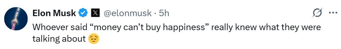 اطلاعات/چند ساعت بعد از انتشار خبر ۸۵۰ میلیارد دلاری شدن ایلان ماسک، مرد میلیاردر در توییتی نوشت: هر کسی که گفته «پول خوشبختی نمیآورد» واقعاً میدانسته درباره چه چیزی صحبت میکند. او توییت خود با ایموجی غمگین تمام کرد!