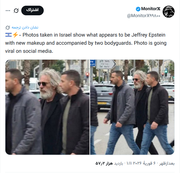 صفحه‌ای به نام «MonitorX» با بیش از ۱۰۰ هزار دنبال‌کننده نیز ادعا کرده است: «تصاویری که در اسرائیل گرفته شده، فردی شبیه جفری اپستین را نشان می‌دهد که با آرایش و همراه با دو محافظ دیده می‌شود؛ تصاویری که در شبکه‌های اجتماعی به‌سرعت در حال انتشار است.»