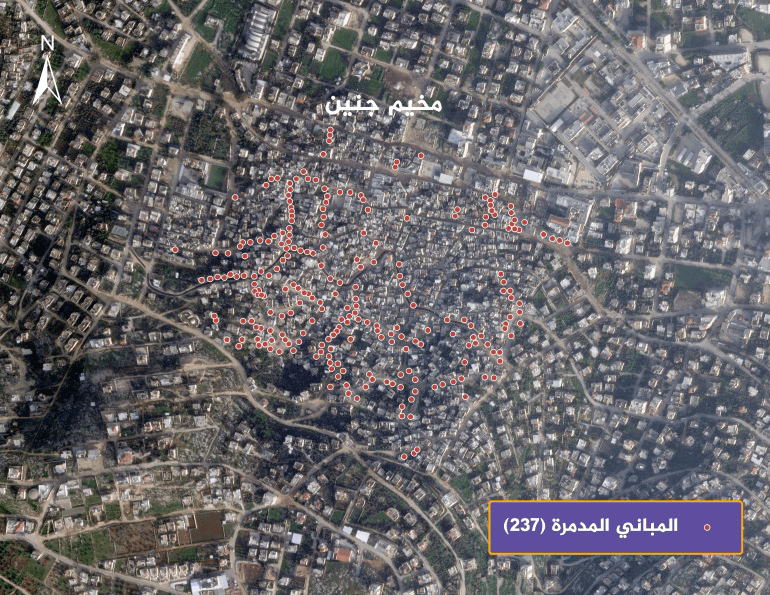 - تخریب زیرساختی سازمانیافته: طبق اعلام شهرداری جنین، بیش از ۷۰ درصد زیرساختهای جادهای و شبکه آب و فاضلاب تخریب شده و در برخی مناطق، دسترسی ۸۰ درصد ساکنان به آب قطع است.