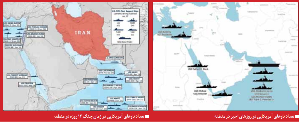 برای درک دقیق‌تر وضعیت فعلی، باید آرایش نظامی کنونی آمریکا بویژه ناوهای جنگی مستقر در دریای عمان را با ۷ ماه قبل مقایسه کرد؛ یعنی زمان جنگ ۱۲ روزه رژیم و آمریکا علیه ایران. آن مقطع، ایالات متحده نه ‌تنها در سطح سیاسی و اطلاعاتی، بلکه در سطح عملیاتی نیز خود را برای یک جنگ تمام‌عیار آماده کرده بود. بیش از ۲۲ فروند شناور و ناو جنگی آمریکا در منطقه حضور داشتند؛ عددی که نشان‌دهنده یک آرایش جنگی کامل و نه صرفا بازدارنده بود. از میان این ناوها، ۲ ناو هواپیمابر سنگین از کلاس نیمیتز، یعنی «کارل وینسون» و «نیمیتز» به منطقه اعزام شده بودند.
