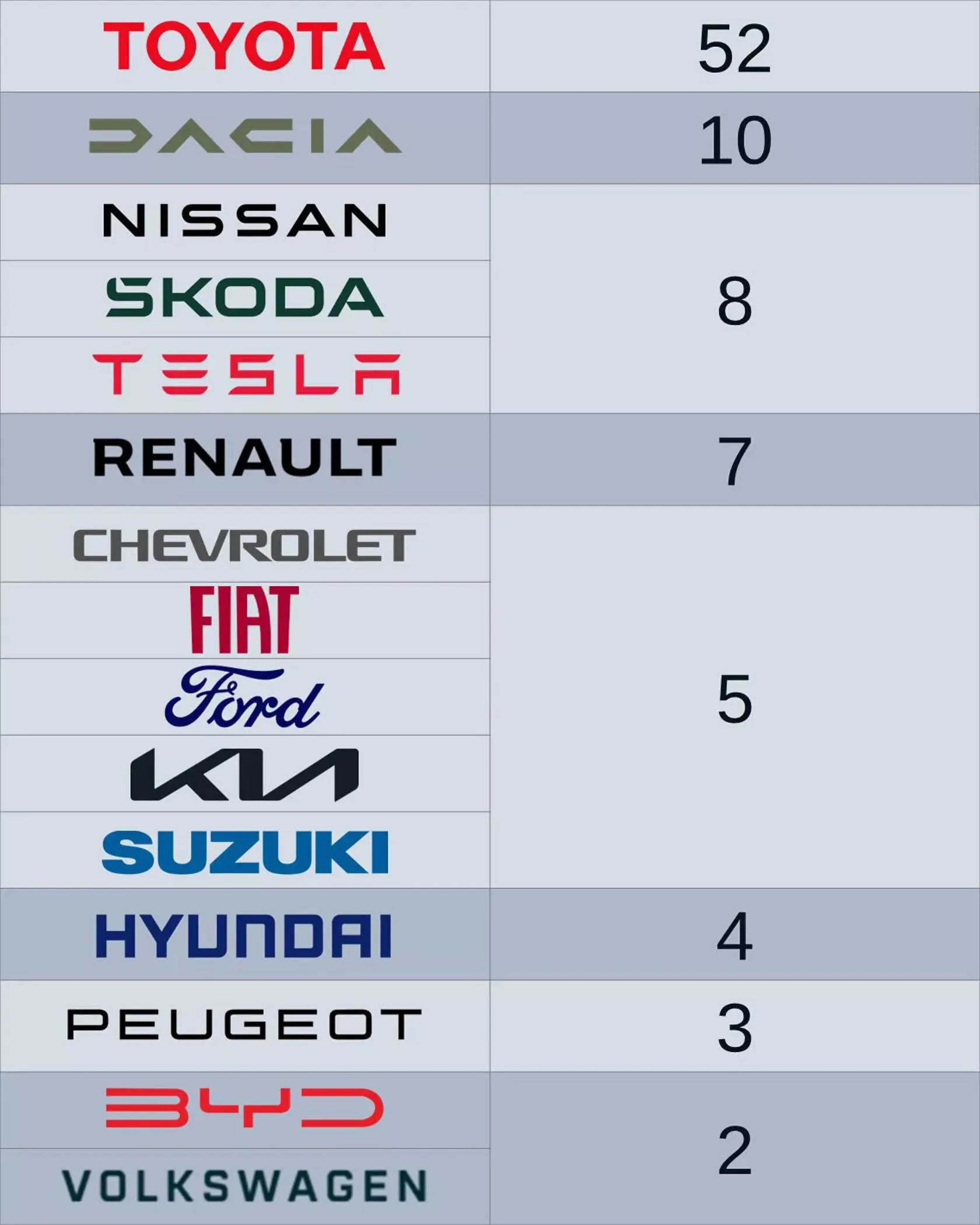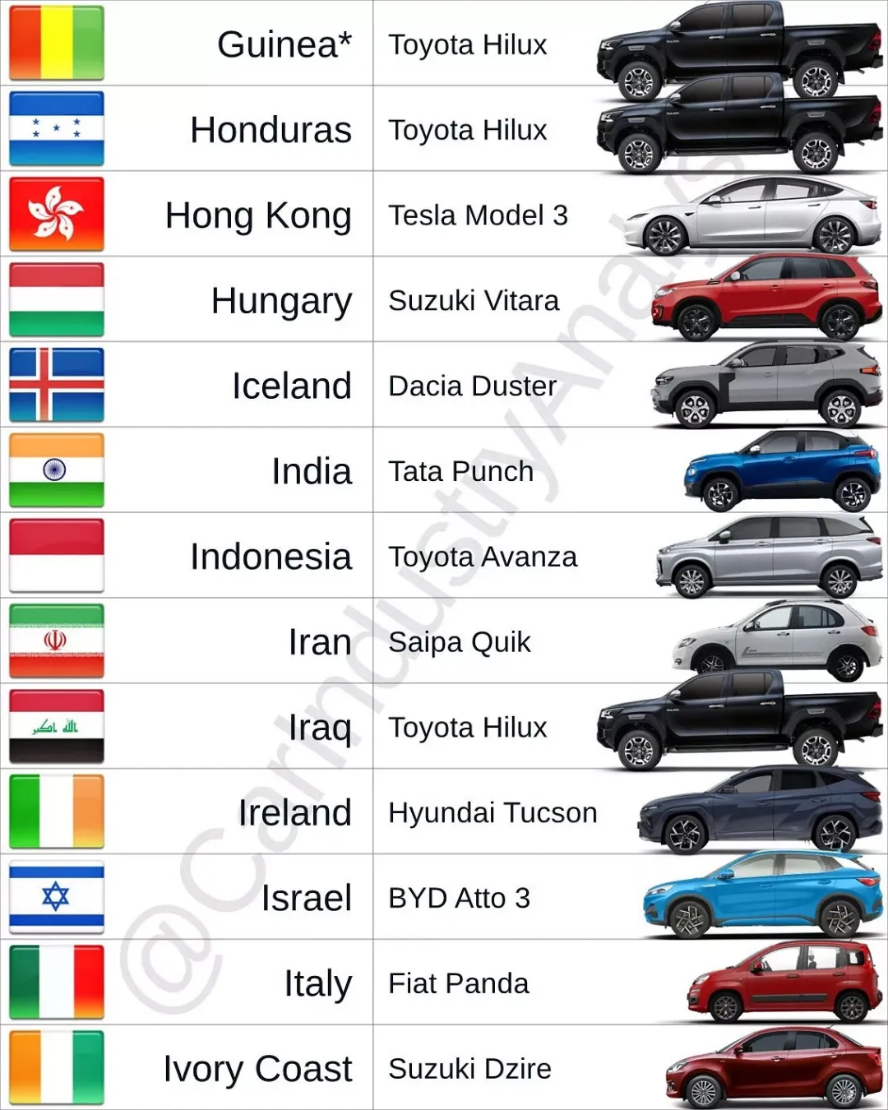 این گزارش همچنین نامهای کمتر شناختهشدهای را بهعنوان پرفروشترینها معرفی میکند. برای مثال، کراساوور کوچک جیلی کولری در بلاروس، جتور X70 (فیدلیتی پرایم) در آنگولا، پژو لندترک در تونس و سایپا کوییک در ایران پرفروشترین خودروها بودهاند. این تنوع گسترده نشان میدهد که سلیقه و نیازهای بازار در هر گوشه از جهان چقدر میتواند متفاوت باشد. درمجموع، خودروهای تویوتا در 52 کشور جهان عنوان پرفروشترین مدلها را در اختیار دارند که این غول ژاپنی را با اختلاف در صدر لیست قرار میدهد درحالیکه داچیا با تنها 10 کشور در رتبهٔ دوم قرار دارد.