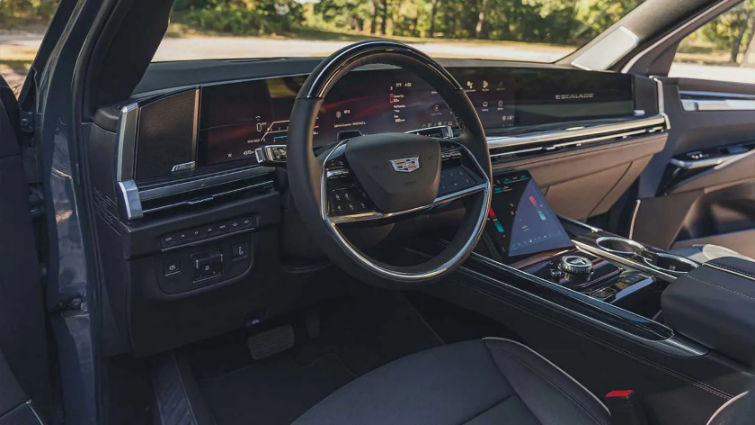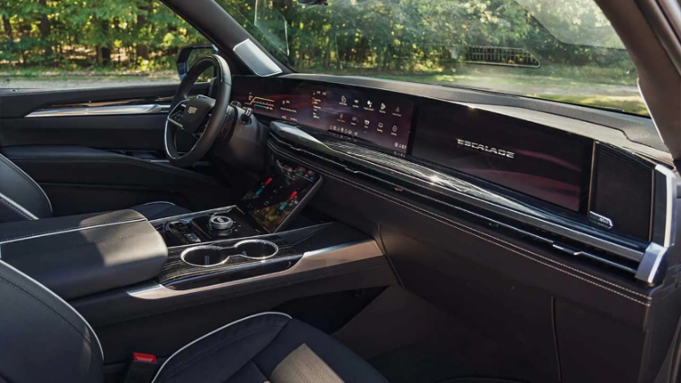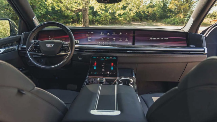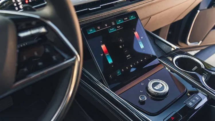 درباره نمایشگرها حرفهای زیادی برای گفتن وجود دارد. بهروزرسانی ۲۰۲۵ یک نمایشگر منحنی عظیم ۵۵ اینچی را در عرض داشبورد جای داده که شبیه به آنچه در لینکلن نویگیتور جدید میبینیم است اما برخلاف نویگیتور، نمایشگر کادیلاک از میان فرمان دیده میشود، نه از بالای آن و فرمان کادیلاک بهجای شکل مربعمانند نویگیتور، گرد باقی مانده است. از دید ما، این طراحی کادیلاک کاربرپسندتر است. با چنین نمایشگر بزرگی، کادیلاک یک نمایشگر نقطه کور اضافه کرده است. این دوربینی است که با فعال شدن راهنما، نمای کنار خودرو را نشان میدهد. همچنین سیستم دید در شب سفارشی در نمایشگر جلوی راننده ظاهر میشود و ناوبری واقعیت افزوده استاندارد، با نمایش تصاویر دوربین جلو و فلشهای جهتیابی، در همان فضا ارائه میشود.