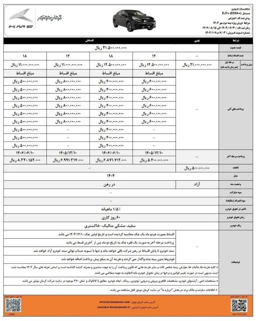 به گزارش آخرین خودرو؛ شرکت کرمان موتور شرایط فروش و افزایش قیمت سدان برقی خود را ویژه آبان ماه ۱۴۰۴ با اعلام کرد. در شرایط فروش کرمان موتور کی ام سی EJ7 پلاس سدان برقی این شرکت به صورت نقد و اقساط عرضه می شود. قیمت اعلام شده برای این خودرو افزایش ۲۰۰ میلیون تومانی را نسبت به قیمت قدم تجربه کرده و قیمت KMC EJ7 PLUS از ۱,۹۵۰,۰۰۰,۰۰۰ به ۲,۱۵۰,۰۰۰,۰۰۰ رسیده است. کرمان موتور موعد تحویل ۶۰ روزه را برای این خودرو در نظر گرفته و سود تاخیر به ازاء هر ماه برای این خودرو ۱.۵ درصد ماهانه تعیین شده است. مدت زمان اقساط موجود در این شرایط فروش ۱۲ و ۱۸ ماه بوده که برای هر کدام پیش پرداخت های مختلفی دارند.