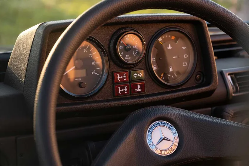 این G کلاس خاص با رنگ سبز نظامی و جزئیات مشکی، وفاداری خود را به ریشههایش حفظ کرده است. سقف پارچهای تاشو، گارد جلو و لاستیکهای پهن که روی رینگهای ۱۸ اینچی مرسدس آستاروث سوار شدهاند، ظاهری خشن و آماده برای ماجراجویی به آن میبخشند. یکی از ویژگیهای جذاب و کلاسیک این خودرو، قابلیت خواباندن شیشه جلو است که تجربهای بینظیر از رانندگی در طبیعت را فراهم میکند.