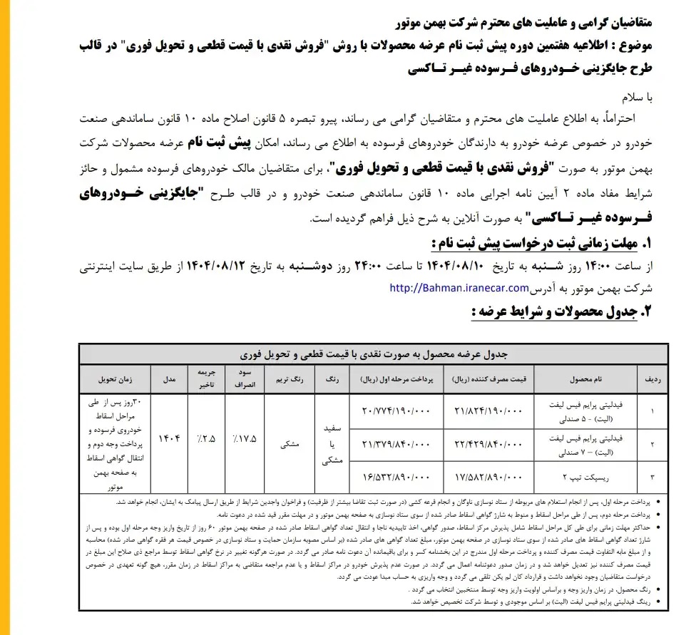 شرکت بهمن موتور بخشنامه هفتمین شرایط فروش محصولات خود ویژه متقاضیان عادی، جوانی جمعیت و خودروهای فرسوده را ویژه آبان ۱۴۰۴ اعلام کرد. در شرایط فروش شرکت بهمن موتور فیدلیتی الیت ۵ نفره، فیدلیتی پرایم فیس لیفت ۷ نفره و ریسپک ۲ به صورت فروش فوری عرضه می شود. مدت زمان در نظر گرفته شده برای تحویل این خودرو ها ۳۰ روزه است. خودرو ریسپکت مختص به طرح جوانی جمعیت و جایگزینی خودروهای فرسوده است. قیمت اعلامی برای این خودرو ها به صورت قطع می باشد.