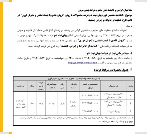 شرکت بهمن موتور بخشنامه هفتمین شرایط فروش محصولات خود را ویژه متقاضیان عادی، جوانی جمعیت و خودروهای فرسوده با تحویل ۳۰ روزه اعلام کرد