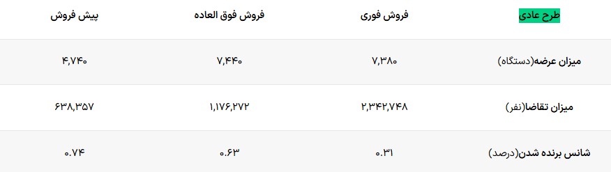 در طرح متقاضیان عادی میزان خودرو هایی در نظر گرفته شده برای عرضه ۱۹,۵۶۰ دستگاه بوده که در سه طرح فروش فوری، فوق العاده و پیش فروش عرضه می شدند. طرح عادی ایران خودرو به دلیل نبود محدودیت های خاص همانند دو طرح فروش دیگر بیشترین متقاضی را به خود جذب کرد که تعداد آنها ۴,۱۵۷,۳۷۷ نفر بوده است.