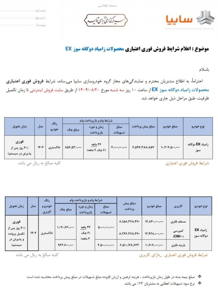 شرکت زامیاد زیرمجموعه خودرو سازیی سایپا دومین خودروساز بزرگ کشور شرایط فروش فوری کامیونت ارتقاء یافته خود را در سه تیپ اعلام کرد. در این شرایط فروش وانت نیسان آبی ارتقاء یافته با تیپ دوگانه سوز عرضه می شود. طرح فروش زامیاد EX به صورت فوری و موعد تحویل ۳۰ روزه است. نسخه دوگانه سوز زامیاد EX با کاربری رایج به صورت نقدی عرضه می شود و نسخه کمپرسی، مسقف فلزی و باربند دار این خودرو به صورت اعتباری عرضه می شود. قیمت قطعی اعلامی سایپا برای زامیاد EX دوگانه سوز یا همان نیسان آبی ارتقاء یافته دوگانه سوز ۱,۰۳۰,۷۵۰,۰۰۰ تومان است و نسخه سقف فلز ۱,۲۸۴,۰۰۰,۰۰۰ و کمپرسی ۱,۲۹۲,۸۰۰,۰۰۰ تومان است و نسخه باربند دار ۱,۰۷۰,۶۰۰,۰۰۰ عرضه می شود. زامیاد EX نمونه بروزرسانی شده و یا استاندارد شده از وانت نیسان معروف است که بعد از چالش های فراوان سازمان استاندارد و سایپا این شرکت دست به توسعه این تیپ از نیسان آبی را داد.