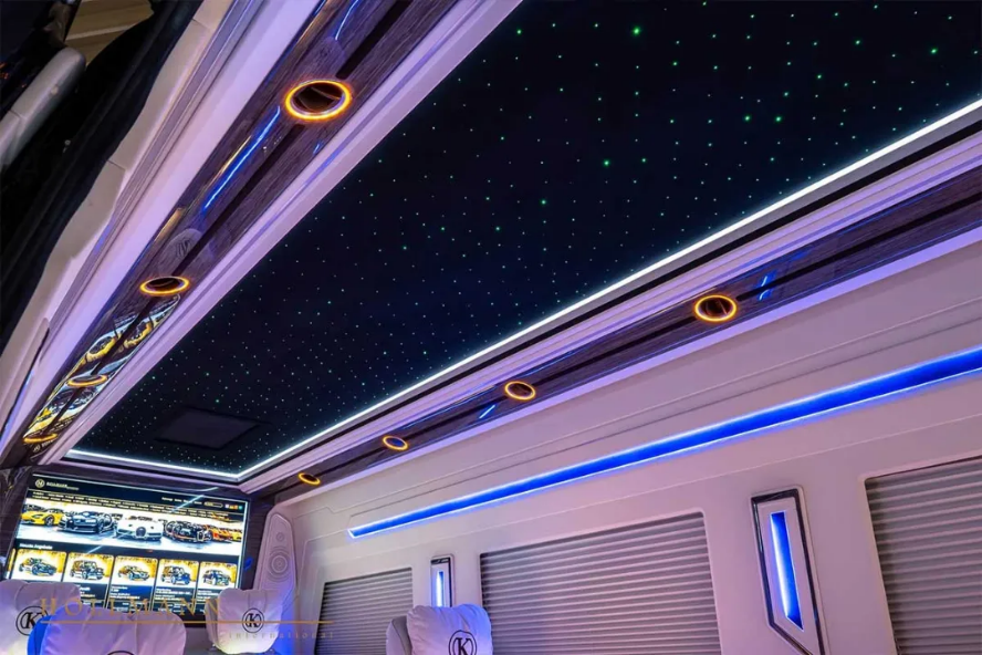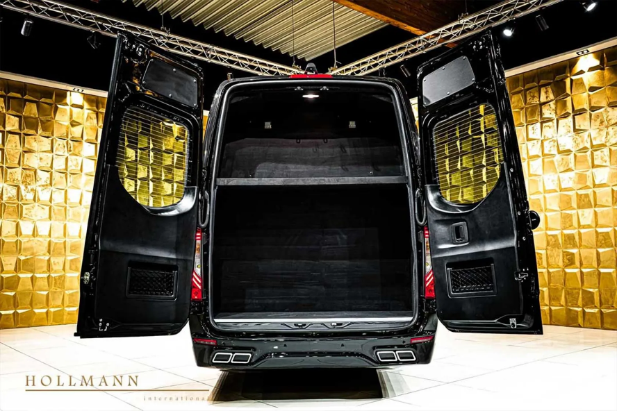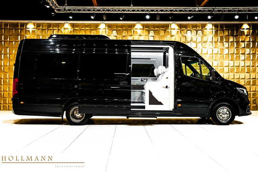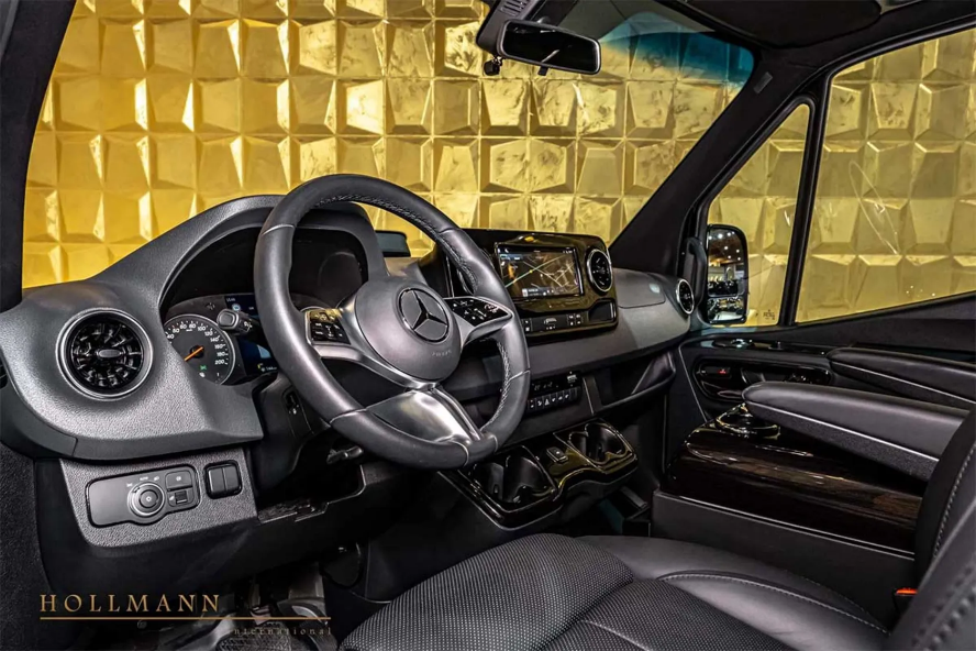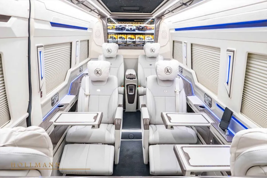 برخلاف ظاهر ساده و بیادعای بیرونی که آن را شبیه به یک ون معمولی نشان میدهد، فضای داخلی این اسپرینتر یک دنیای کاملاً متفاوت است. پس از باز شدن درب کشویی، یک پلهٔ برقی برای ورود آسان ظاهر شده و سرنشینان را به کابینی مجلل با ۶ صندلی کاپیتانی مستقل راهنمایی میکند. این صندلیها که با چرم بژ پوشیده شدهاند، به امکاناتی نظیر گرمکن، سردکن و ماساژور مجهز هستند. علاوه بر این، دو تلویزیون بزرگ، سیستم نورپردازی محیطی، پردههای برقی برای حفظ حریم خصوصی، میزهای تاشو، یک بار کوچک و سقفی با طرح آسمان پرستاره، تجربهای شبیه به سفر با جت شخصی را روی زمین فراهم میکنند.