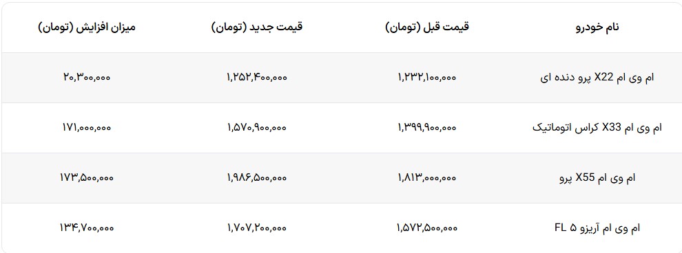 شرکت مدیران خودرو قیمت محصولات ام وی ام را ویژه آبان ماه ۱۴۰۴ اعلام کرد. بنا به اعلام شرکت مدیران خودرو قیمت محصولات ام وی ام افزایش یافته است. قیمت محصولات مدیران خودرو در تمامی سری ها افزایش یافته است ولی سری ام وی ام نسبت به سایر بخش ها حائز اهمیت تر است؛ تولیدات ام وی ام بیشترین سهم تولید را در بین محصولات مدیران خودرو را به خود اختصاص داده اند. در افزایش قیمت مدیران خودرو ام وی ام X22 پرو دنده ای، ام وی ام X33 کراس اتوماتیک، ام وی ام X55 پرو و ام وی ام آریزو ۵ FL افزایش یافته است.
