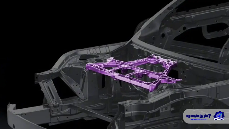میله یا تیر جلو به عنوان مسیر اصلی انتقال و توزیع نیرو در زمان برخورد عمل کرده و از محفظه سرنشینان محافظت میکند. افزون بر این، این میله محل نصب مجموعه قطعات سامانه حرارتی از جمله ماژول تهویه مطبوع، کمپرسور، مبرد و سیستم خنککننده است. این یکپارچهسازی موجب کوچکتر شدن محفظه فنی جلو و امکان ایجاد یک فضای ذخیره جلویی (اصطلاحاً Frunk) با حجم ۱۴۱ لیتر شده است.