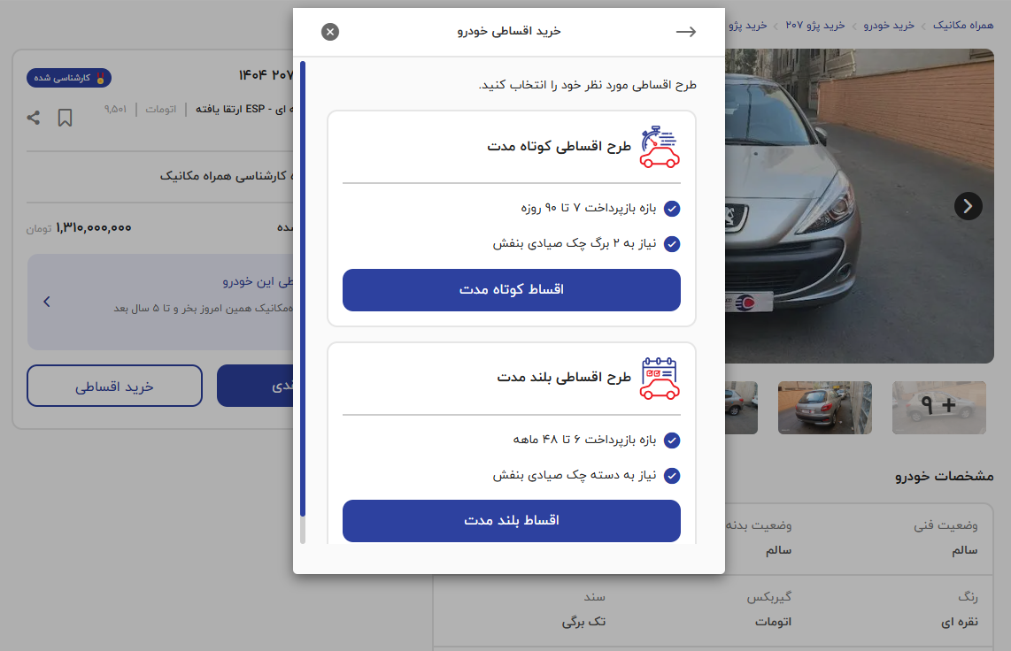 پس از ورود به این لینک، میتوانید از فیلترهای کنار صفحه برای پیدا کردن خودروی موردنظر خود کمک بگیرید. سپس روی آگهی موردنظر کلیک کنید و بعد از بررسی عکسها، گزارش کارشناسی و مشخصات خودرو، روی خرید اقساطی کلیک کنید. در پنجره باز شده، دوره بازپرداخت را انتخاب کنید و ثبت درخواست خرید اقساطی را بزنید تا کارشناسان همراه مکانیک با شما تماس بگیرند و مابقی فرایند خرید اقساطی خودرو را پیش ببرند.