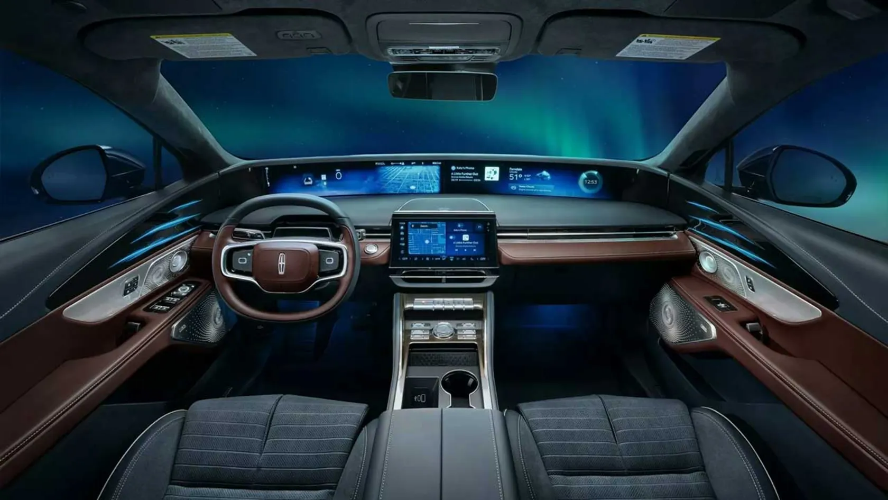 برای ایجاد تضاد و افزودن به حس لوکس بودن، از جزئیات مسی، تزئینات چوبی و همچنین رنگ قرمز تیره در بخشهایی از داشبورد، پنل درها و فرمان استفاده شده است؛ اما جادوی اصلی اینتم در بخش دیجیتال آن نهفته است. نمایشگرهای عریض کابین میتوانند الگوها و رنگهای رقصان شفق قطبی را به نمایش بگذارند. این ویژگی در حالت Lincoln Rejuvenate برجستهتر میشود؛ حالتی که با فعالسازی آن، صندلی راننده به عقب حرکت میکند، ماساژور و گرمکن فعال میشوند و نمایشگرها با تصاویر آرامشبخش شفق قطبی، فضایی بینظیر برای استراحت خلق میکنند.