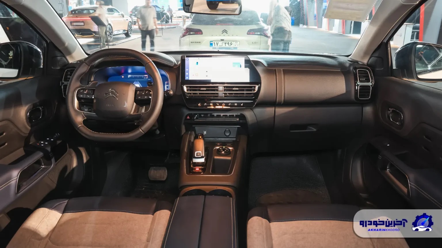 داشبورد سیتروئن C5 Aircross با طراحی لایه ای افقی شکل گرفته است؛ رویکردی که در سال های اخیر میان سازندگان اروپایی محبوب شده و هدفش ایجاد حس عریض بودن، آرامش بصری و نظم در دید راننده است. خطوط نرم و سیال در بخش بالایی، به همراه نوار تزیینی پهن در بخش میانی، ترکیبی مدرن به وجود آورده اند. نمایشگر شناور مرکزی، هرچند ظاهری مینیمال و هماهنگ با فضای کابین دارد، اما اتکای کامل بخش تهویه به کنترل های لمسی باعث می شود کاربری آن در هنگام رانندگی کمی چالش برانگیز باشد. با این حال، جنس متریال نرم و دوخت های هماهنگ، جلوه ای خوش ساخت و دلپذیر به داشبورد می بخشند.