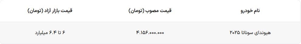 با آغاز تحویل هیوندای سوناتا 2025 پس از چند ماه تاخیر، این سدان کره ای در بازار آزاد قیمت گذاری شده است. با توجه به آگهی های منتشر شده در وبسایت ها و اینستاگرام، این خودرو قیمت ۶ میلیارد تومان تا ۶ میلیارد و ۴۰۰ میلیون تومان برای فروش گذاشته شده است. این احتمال وجود دارد تا با افزایش تحویل سوناتا جدید توسط هرمس خودرو، تا حدی قیمت این خودرو در بازار آزاد کاهش پیدا کند.