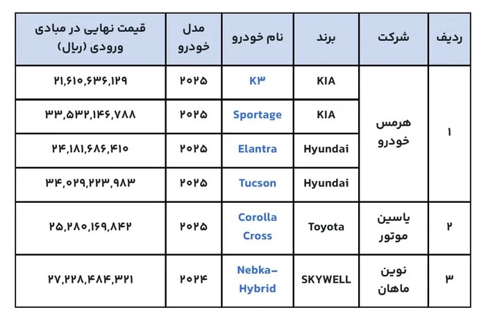 به گزارش تجارت نیوز،در سومین دوره عرضه خودروهای وارداتی در سال جاری، ۶ مدل خودرو عرضه شده که قیمت این خودروها از ۲ میلیارد و ۱۰۰ میلیون تومان تا چهار میلیارد و ۸۰۰ میلیون تومان است.