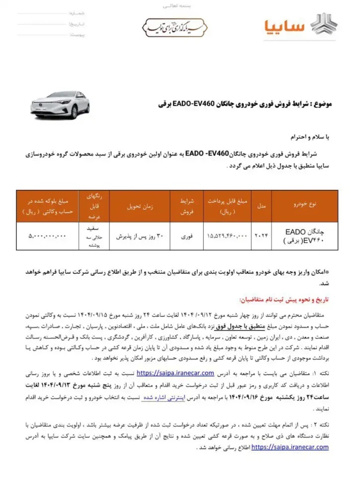 به تازگی بخشنامه فروش چانگان ایدو برقی (EADO EV460) به عنوان خودروی تمام‌برقی گروه خودروسازی سایپا منتشر شده است. سایپا این خودرو را برای اولین بار از طریق قرعه کشی و تنها در رنگ سفید و مدل ۲۰۲۴ عرضه می کند. طبق اعلام شرکت، موعد تحویل خودرو ۳۰ روزه خواهد بود. متقاضیان می توانند پس از افتتاح حساب وکالتی به مبلغ ۵۰۰ میلیون تومان از روز سه شنبه ۱۱ آذرماه تا روز شنبه ۱۵ آذرماه با مراجعه به سایت فروش شرکت سایپا نسبت به ثبت نام اقدام نمایند.