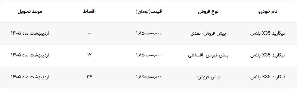شرکت تیگارد موتور قیمت و شرایط فروش کراس اوور اقتصادی خود را ویژه آذر ماه ۱۴۰۴ اعلام کرد. در شرایط فروش تیگارد موتور کراس اوور تیگارید X35 پلاس به صورت نقد و اقساطی عرضه می شود. در شرایط فروش تیگارد موتور قیمت تیگارد ایکس ۳۵ پلاس افزایش ۲۵۰ میلیون تومانی را تجربه کرده و قیمت این کراس اوور از ۱,۶۰۰,۰۰۰,۰۰۰ به ۱,۸۵۰,۰۰۰,۰۰۰ افزایش یافته است. در شرایط اقساطی این خودرو در اقساط ۱۲ و ۲۴ ماه عرضه می شود و تا ۸۰۰ میلیون تومان به صورت شرکت به خریداران وام داده می شود. موعد تحویل اعلامی برای این خودرو اردیبهشت ماه ۱۴۰۵ است.