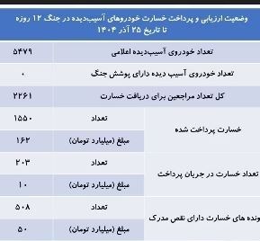 تسنیم/آخرین گزارش از روند ارزیابی و پرداخت خسارت خودروهای آسیبدیده در جنگ 12روزه نشان میدهد تا پایان 25 آذر 1404 خسارت 1550 دستگاه خودرو پرداخت شده و مجموع مبالغ واریزی به زیاندیدگان به 162میلیارد تومان رسیده است.