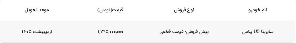 شرایط فروش سابرینا U5 پلاس اعلام شد – آذر ۱۴۰۴