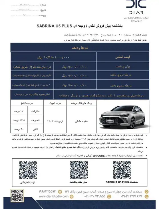 شرکت دیار خودرو شرایط فروش سدان اقتصادی خود را ویژه آذر ماه ۱۴۰۴ اعلام کرد. در شرایط فروش دیار خودرو، سابرینا U5 پلاس به صورت پیش فروش عرضه می شود. موعد تحویل اعلامی برای این خودرو اردیبهشت سال ۱۴۰۵ بوده و به ازاء هر ماه تاخیر سود ۳۰ درصدی برای مشتریان محاسب خواهد شد. قیمت سابرینا یو ۵ پلاس، در پیش فروش جاری در آذر ماه ۱۴۰۴ به صورت قطعی است و در چهار مرحله از مشتری دریافت می شود.