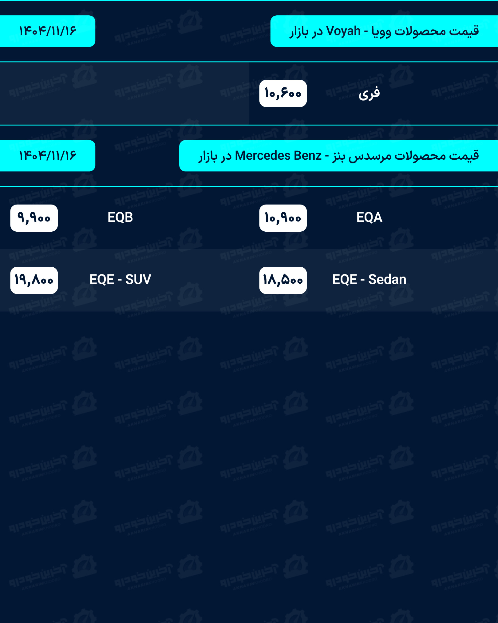 لیست قیمت خودرو روزانه در وب سایت آخرین خودرو به روز رسانی می شود. شما عزیزان می توانید برای دریافت قیمت روز تمامی محصولات داخلی، مونتاژی و وارداتی به بخش قیمت خودرو در سایت آخرین خودرو مراجعه نماید.
