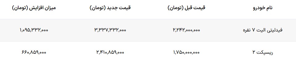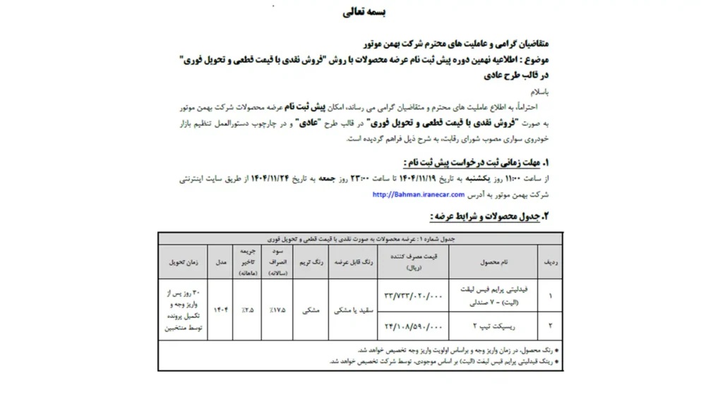 چند روز قبل بود که افزایش قیمت شدیدی برای محصولات بهمن موتور اعلام شده بود که البته بعد به صورت رسمی تکذیب گردید. حالا این شرکت اطلاعیه نهمین دوره پیش ثبت نام دو محصول خود را با روش فروش نقدی با تحویل فوری منتشر کرده که همراه با آن قیمت جدید این دو محصول خم مشخص شده است. در این شرایط فروش دو خودرو فیدلیتی الیت 7 نفره و ریسپکت ۲ برای متقاضیان عادی و جوانی جمعیت به عرضه می رسند و متقاضیان می توانند از ساعت ۱۱ روز یکشنبه به تاریخ ۱۹ بهمن تا ساعت ۲۳ روز جمعه به تاریخ ۲۴ بهمن از طریق سایت اینترنتی شرکت بهمن موتور اقدام به ثبت نام کنند.