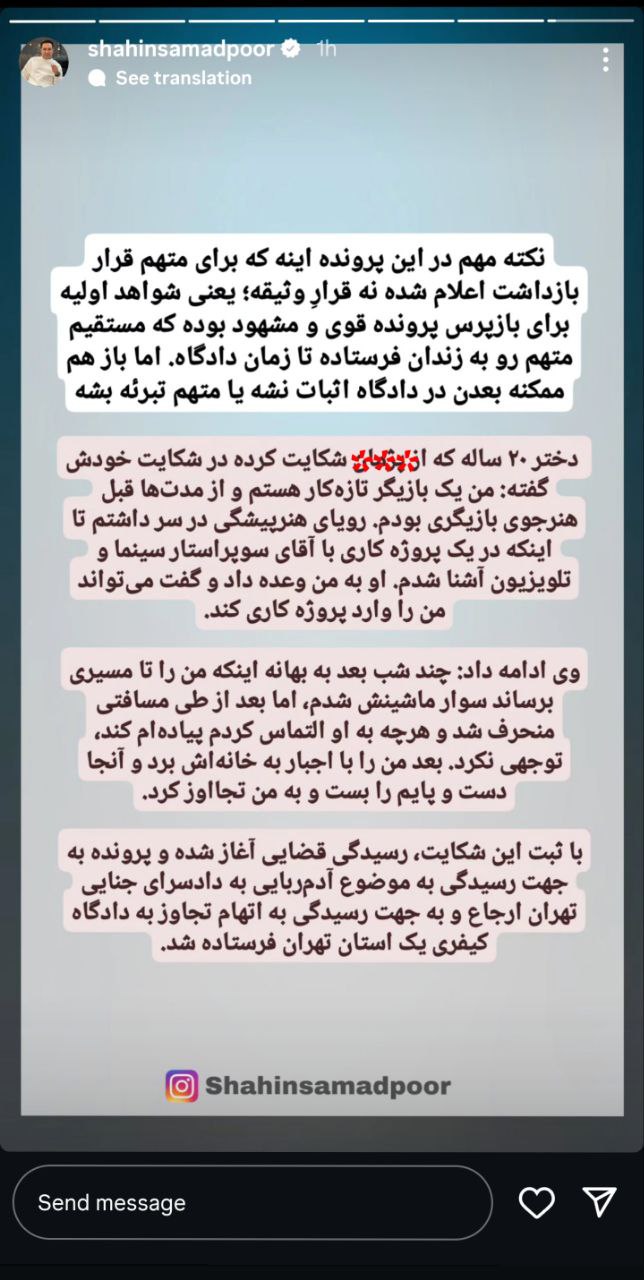 آخرین خبر/ شاهین صمدپور خبرنگار در خصوص پرونده جنجالی بازیگر سینما مدعی شد: