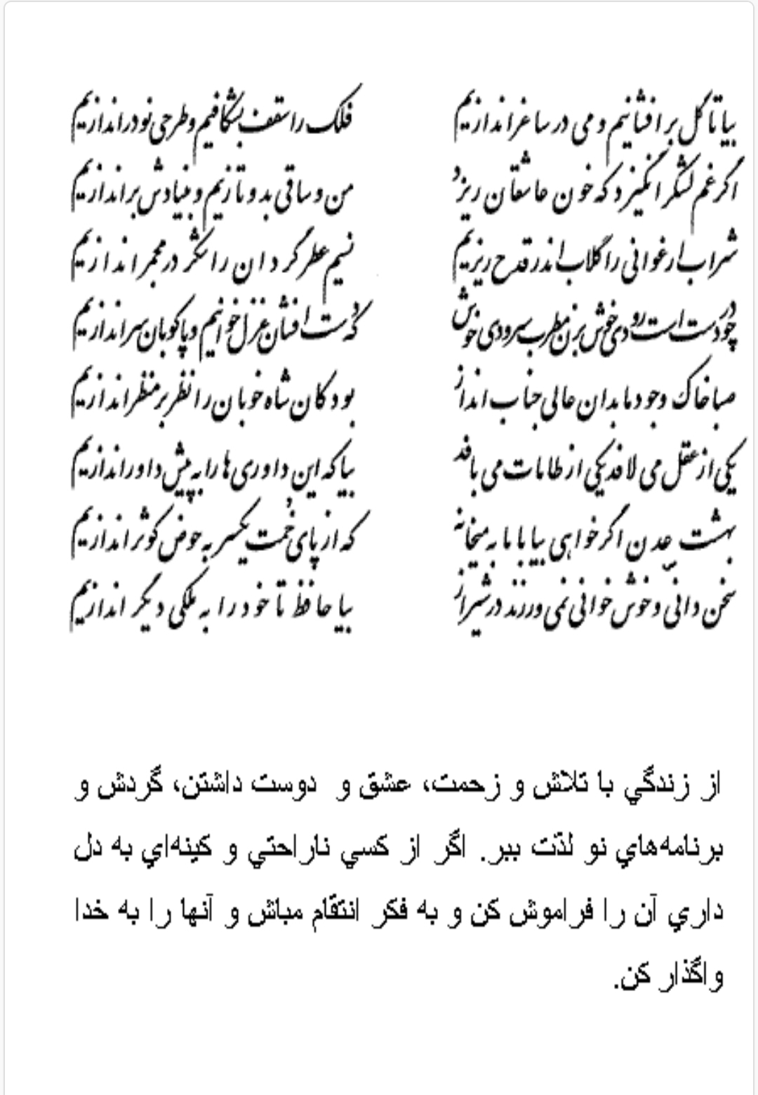 بیتوته/ تشخیص و پذیرفتن خوب و بد از محتوای غزل، بستگی به وضعیت روحی، عاطفی و باور صاحب فال دارد. در هر صورت در هر غزل حافظ بیتی وجود دارد که صاحب فال آن را مناسب آرزو و نیت خود می یابد و همان را به عنوان وصف الحال و جواب حافظ می پذیرد و به آرامش خاطر دست می یابد.